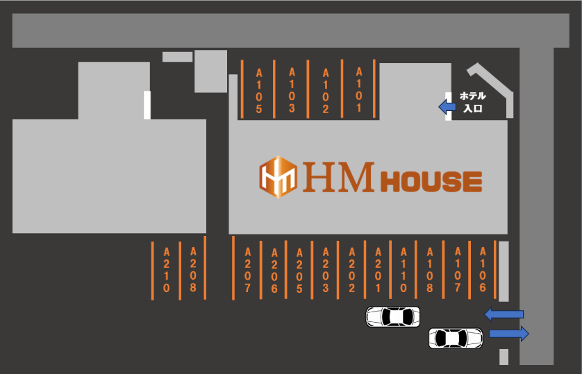 ご予約確認メールに記載のお部屋番号をご確認のうえ、該当する番号の駐車スペースへお停めください。